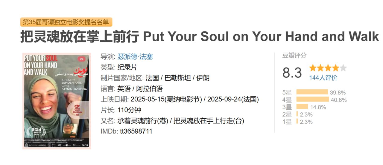 伊朗导演身处法国与巴勒斯坦摄影记者Fatma Hassona保持日常视像通话。断续信号下的零碎对话长达一年,与Hassona 走上街头捕捉的瞬间交织,拼贴出加沙不断重演的日常:轰炸、饥饿、逃难与死亡;然而,画面再模糊,也无法掩盖Hassona 的笑容与希望。康城影展宣布电影入选翌日,年仅25岁的Hassona 及其家人在以军空袭中身亡。「如果我要死,也要死得轰烈,而非成为群众伤亡数字之一。我要留下时间和空间都无法磨灭的画面,让全世界都看见。」视频不只是遥远对话的纪录,也不只是历史的见证,更承载故人坚韧的力量,带领我们继续前行。
