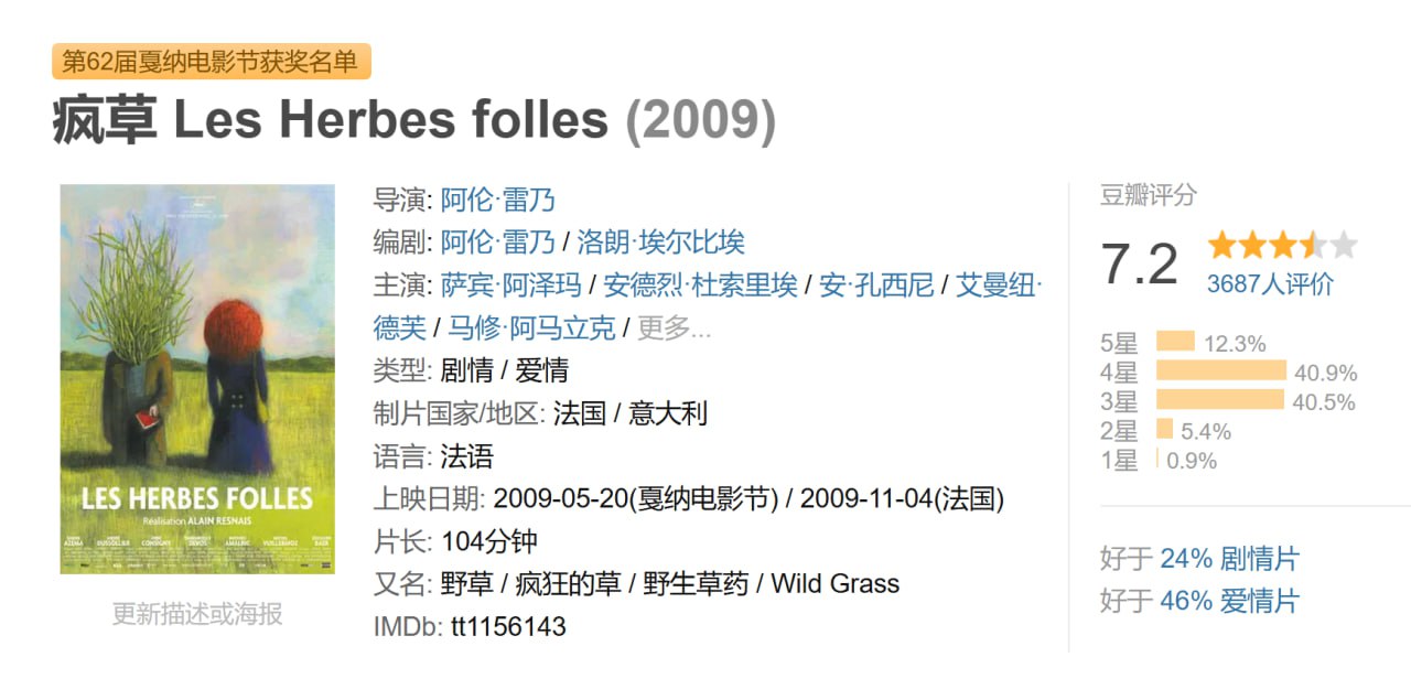 影片根据克里斯蒂安·加伊1996年的小说《意外》改编,这也是雷奈首次直接使用小说改编的剧本。影片讲述一个名叫玛格丽塔的女人从一家商食店走出来时被人抢走了皮包,她没有料到小偷会把空包丢在了停车场,一个名叫乔治的男人捡到这个钱包并对钱包的主人产生了兴趣,故事随着这股情欲流动演变成一个哭笑不得的猫鼠游戏。影片里仍然是充满了雷奈对于意象的追求。雷奈表示,这部影片的主题是关于“欲望的欲望”,取名为《疯草》是因为“片中人物的行动完全是非理性的,就像那些散落在马路和石头缝里的野草种子,没来由地疯长起来。”