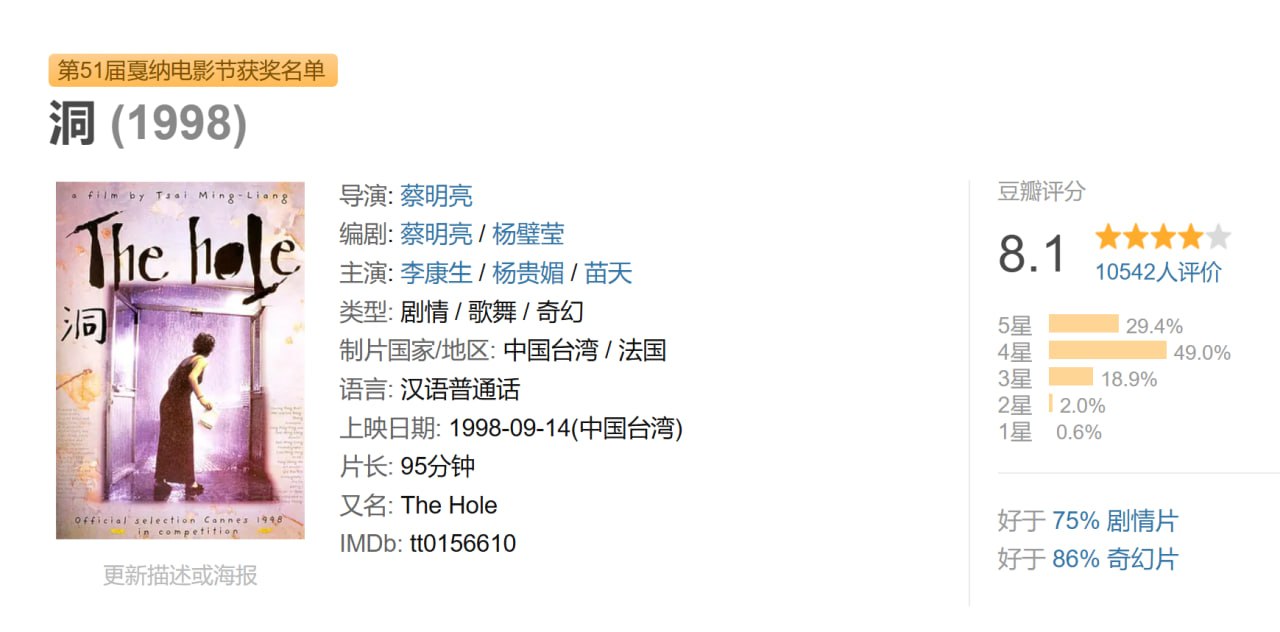 水电工补修水管时为两人留下一下洞,自此,他们借助此洞,开始偷窥对方的生活,试探对方的反应,并在幻想的暗恋中(华丽梦幻的歌舞场景)完成唯一的交流。此洞亦是他们各自所处的(生活)洞穴的出口,相互试探的过程亦是他们爬向出口的过程。——尽管人类世界只剩一男一女,不一定会做亚当与夏娃,但从同类身上获得某种安慰赶走内心深处的孤独,却是人类的天性,他们当然也不例外。