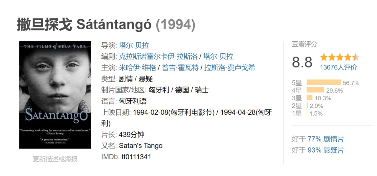全片最精彩两段,一是担当叙事者的医生偷偷记录村民活动,他蹒跚买醉的跟镜,成为最感人的观影存在体验。另一段女孩虐猫,亦写下影史上有数的伤感时刻。没有故弄玄虚,一种交代故事的坦率,让演员在真实时间存在,让观众随他们的情态同步呼吸,个中有导演对电影最大的深情与敬意。七个半小时的每个镜头,个个都是不朽──没有想当然的静止,而是自有一种有机的内在节奏。像小津和德莱叶,塔尔深谙长镜头的真谛。这是必须去经历的,一生难逢的观影经验。