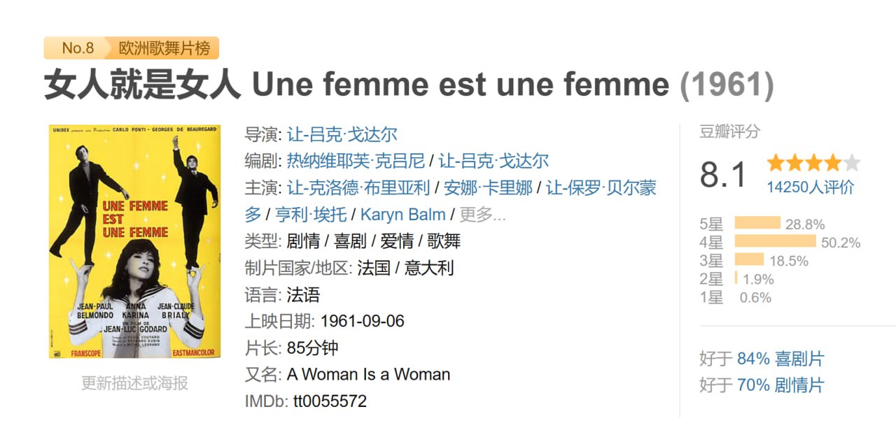 由法国新浪潮奠基者之一让-吕克·戈达尔执导编剧的彩色宽银幕电影《女人就是女人》,是他向好莱坞音乐歌舞片的致敬之作。影片颠覆传统歌舞片模式,是一部“新现实主义歌舞片”。本片荣获1961年第11届柏林国际电影节银熊奖最佳女演员和特别奖两项殊荣,并入围金熊奖。