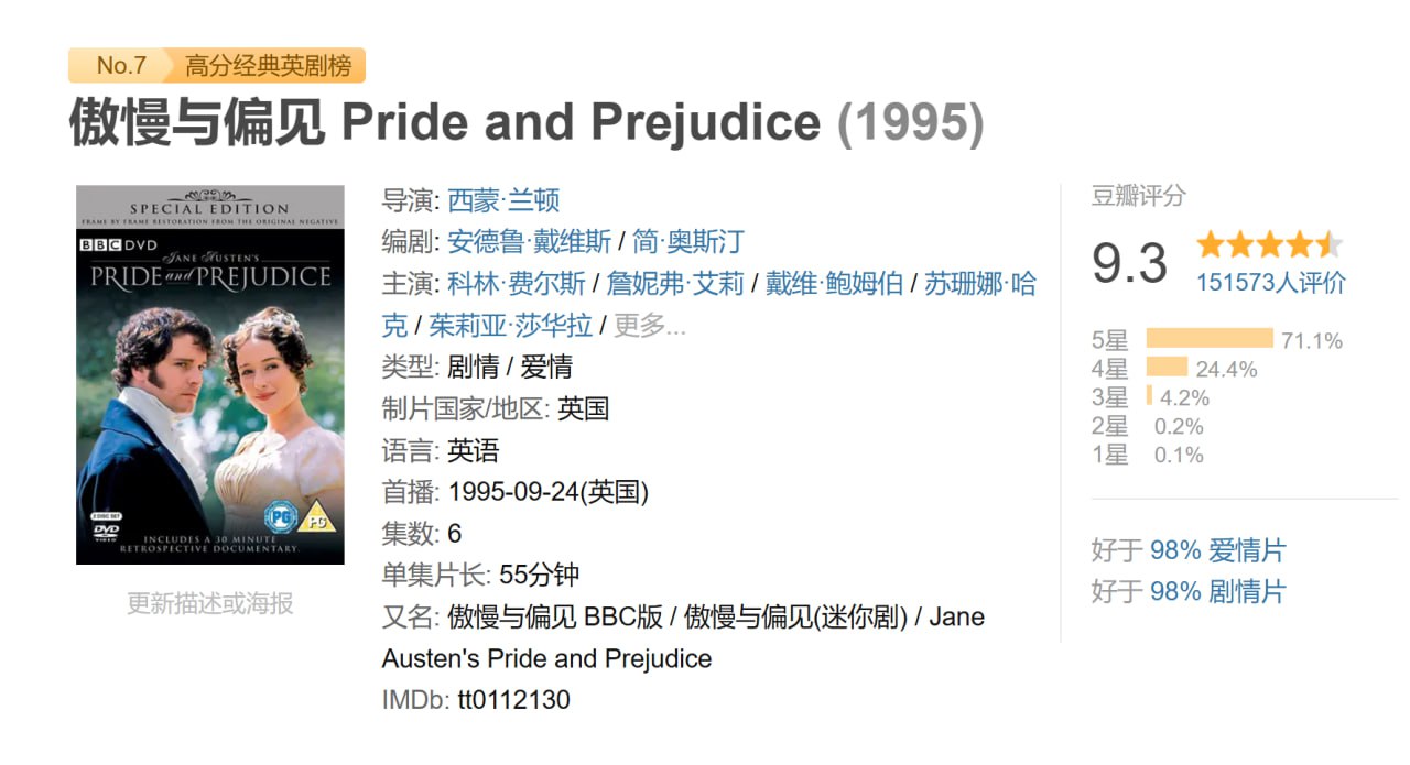 《傲慢与偏见》是简·奥斯汀的代表作。这部作品曾多次被改编的电影,本片为英国BBC公司1995年出品。