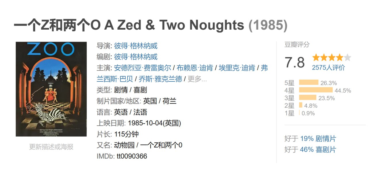 一场车祸夺去了两个动物学家兄弟的妻子,随后,他们一边迷恋着那个在车祸中失去一条腿的女人,一边用摄影机记录各种动物尸体腐烂的过程。在影片静态的画面中,那些鳄鱼、小狗、天鹅、斑马的尸体一点点地变黑、干瘪、喷出腐水、爬出蛆虫。最终,女人那条剩下的腿也“渐渐死去”、被截除,她在生下一对属于两兄弟的双胞胎之后死去。两兄弟则在镜头前注射毒剂,把自己的尸体作为最后一种研究和展示对象。