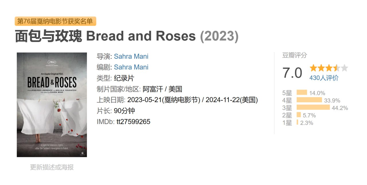 阿富汗导演Sahra Mani的纪录片《面包与玫瑰》记录了自2021年塔利班控制喀布尔以来,生活在塔利班统治下的阿富汗妇女的经历,该片将在戛纳电影节上作为特别展映但愿放映。