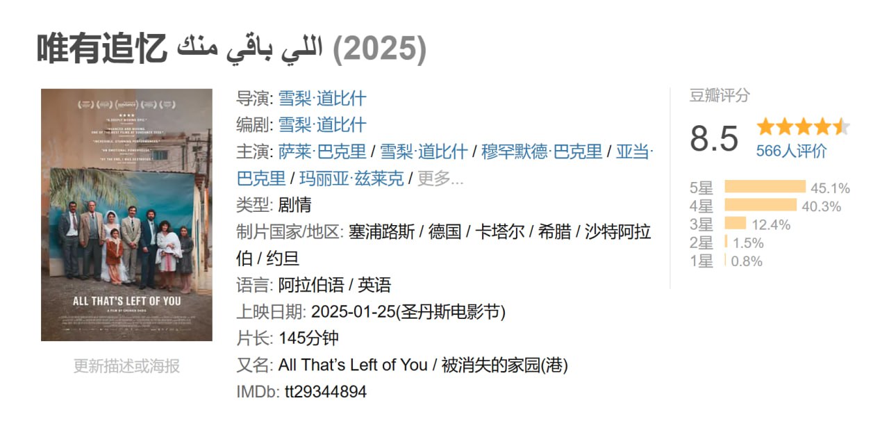 雪梨·道比什极具野心地铺展开一个家族三代人的命运绘卷,横跨整整近75年,影片既宏大又细腻,镜头优雅且饱含个人情感,让人联想到电影史上那些最为经典不朽的家族传奇故事。雪梨·道比什不仅融入自身经历自编自导,还亲自出演了本片,在她饱含深情的讲述下,影片中位于约旦河西岸的富庶家庭,原本过着和乐融融的生活,却因突如其来的战火而饱受摧残,不仅失去了豪宅、庄园和家族的橘子园,也受尽了屈辱。本片精心塑造了生动鲜明的角色群像,他们的生活、梦想和矛盾相互交织,高尚的他们在不公的浪潮中颠沛流离。尽管历经种种磨难,生活仍在继续。这是战火对人的摧残,也是导演借助电影对世人的警示。