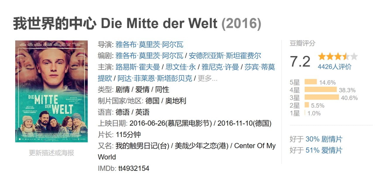 改编自1998年同名青年小说的影片《我世界的中心》于11月10日登陆德国院线。敏感十七岁学生菲利普与最要好的女伴卡特消磨了最后的假日,却在开学伊始被新来的、同样神秘而迷人的尼古拉斯吸引。电影以醒目视觉风格和精彩群体演出展现青春时代的初恋、友谊、家庭秘密和自我探寻的过程,将出柜同性主题极自然地融入其中。