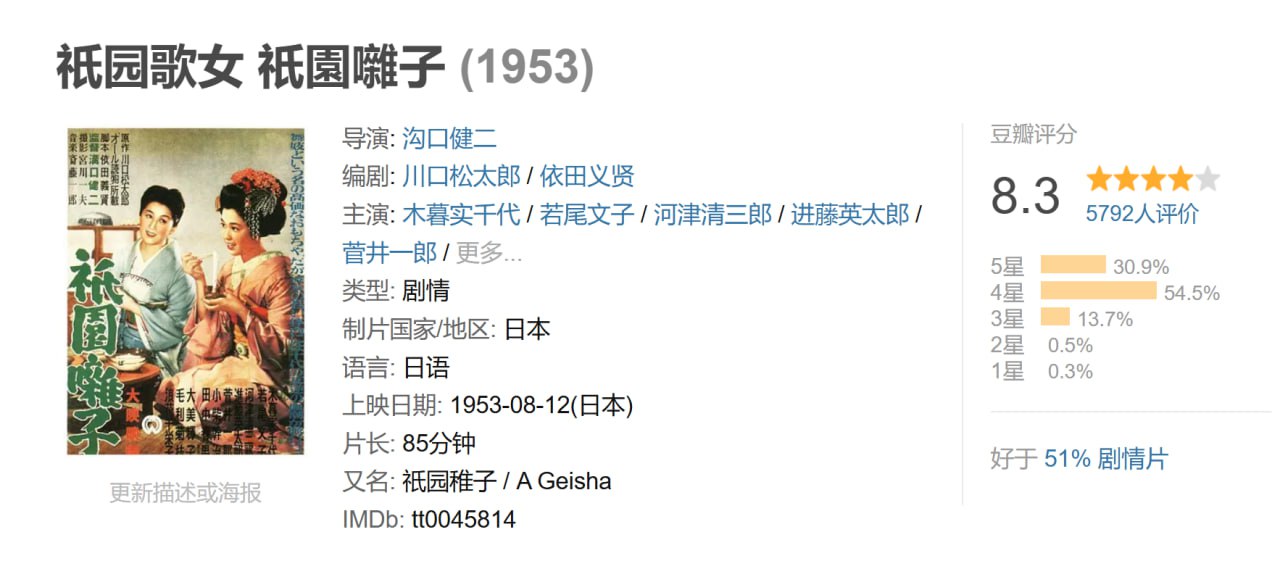 母亲离世,父亲生意失败、疾病缠身,十六岁的荣子(若尾文子 饰)走投无路,只好到祗园投靠母亲生前的艺妓姐妹美代春(木暮实千代 饰)去做见习艺妓。经过美代春的悉心培训,一年后,荣子成为了一名亭亭玉立的艺妓。终于到了荣子第一次接待客人的这一天,美代春领着荣子接待了两名客人——楠田和佐伯。后来美代春和荣子跟着楠田到东京游玩,到达当晚在旅店内,楠田想与荣子发生关系,荣子不肯就范,在反抗中咬伤了他。因为这件事,美代春和荣子的生意大受影响,她们只得闲赋在家。饱受门庭冷落的荣子决定上门亲自道歉,而美代春得知后,急忙赶去替换了荣子。次日,荣子询问一夜未归的美代春是否为了自己而出卖身体。美代春的一番话,让荣子学到了作为艺妓的一套人生哲学。