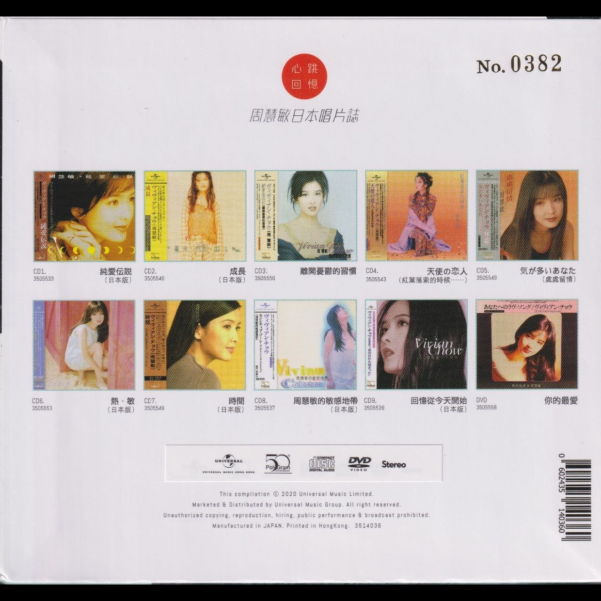 这是环球音乐推出的限量编号套装,收录周慧敏在日本发行的9张专辑,套装包含《純愛伝說》《成長》《離開憂鬱的習慣》等原版专辑,以及《天使の恋人》《気が多いあなた》等日文作品。它复刻了日版音质与封面,限量编号极具收藏意义,是歌迷重温周慧敏日系音乐生涯的珍贵载体。