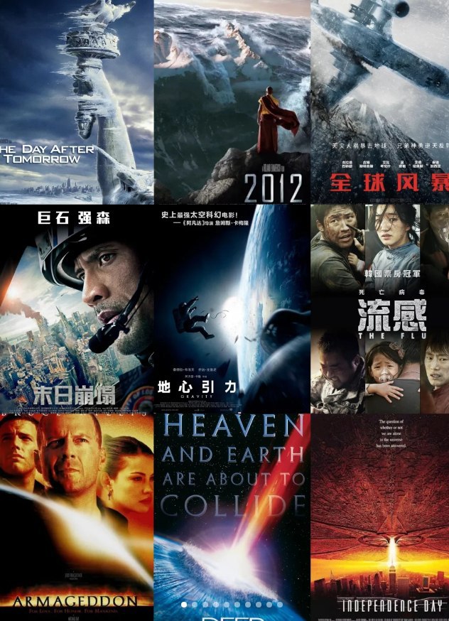 后天 (2004)、流感 (2013)、龙卷风 (1996)、传染病 (2011)、摩天楼 (2012)、龙卷风 (2024)、世界末日 (1998)、完美风暴 (2000)、二零一二 (2009)、神秘代码 (2009)、海啸奇迹 (2012)、庞贝末日 (2014)、末日崩塌 (2015)、月球陨落 (2022)、天地大冲撞 (1998)、唐山大地震 (2010)、北海 (2021)、地心抢险记 (2003)