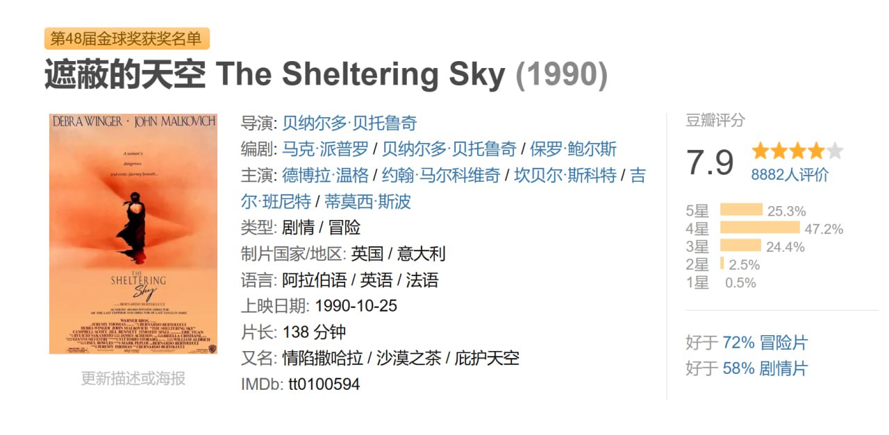 作曲家波特(约翰·马尔科维奇 John Malkovich 饰)和作家妻子姬特(德博拉·温格 Debra Winger 饰)在二战后携两人的朋友雷纳(坎贝尔·斯科特 Campbell Scott 饰)一起来到北非撒哈拉旅行。在神秘而捉摸不定的沙漠中,波特和姬特的婚姻危机似乎也因此得到了异样 的缓和——波特流连于和当地的妓女寻欢,而姬特却和雷纳发生了关系。在夫妻关系的断裂中,波特和姬特重新意识到对方对自己的重要性。然而此时波特不幸染上霍乱,姬特带着他辗转奔袭在撒哈拉,严酷的沙漠吞噬了希望,最终波特还是离姬特而去。姬特在悲痛中阴差阳错跟随一支驼队继续在沙漠中踯躅,并成为驼队的女人,在无尽的沙漠中渐行渐远……