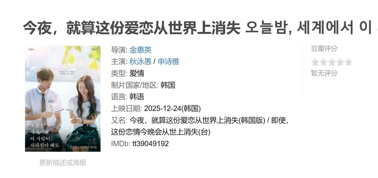 今夜,就算这份爱恋从世界上消失 오늘밤, 세계에서 이 사랑이 사라진다 해도 (2025)