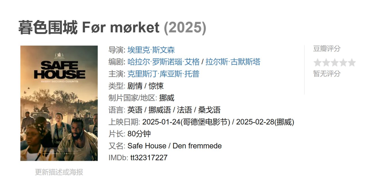 《安全屋》改编自2013年圣诞夜在中非共和国无国界医生野战医院发生的真实事件。内战激烈,班吉被分为穆斯林和基督徒两个部分。突然,一名绝望男子出现在城市基督教区的诊所,援助人员正努力挽救生命。他是穆斯林,遭受迫害,面临迫在眉睫的危险。外面,一支激进的民兵要求交出该男子,迫使诊所安全主管挪威人林恩面对深刻的道德困境。埃里克·斯文森和出色的演员克里斯汀·库贾斯·索普和亚历山大·卡里姆巧妙地探讨了勇气和生命价值的主题,这部强而有力且发人深省的剧情片。