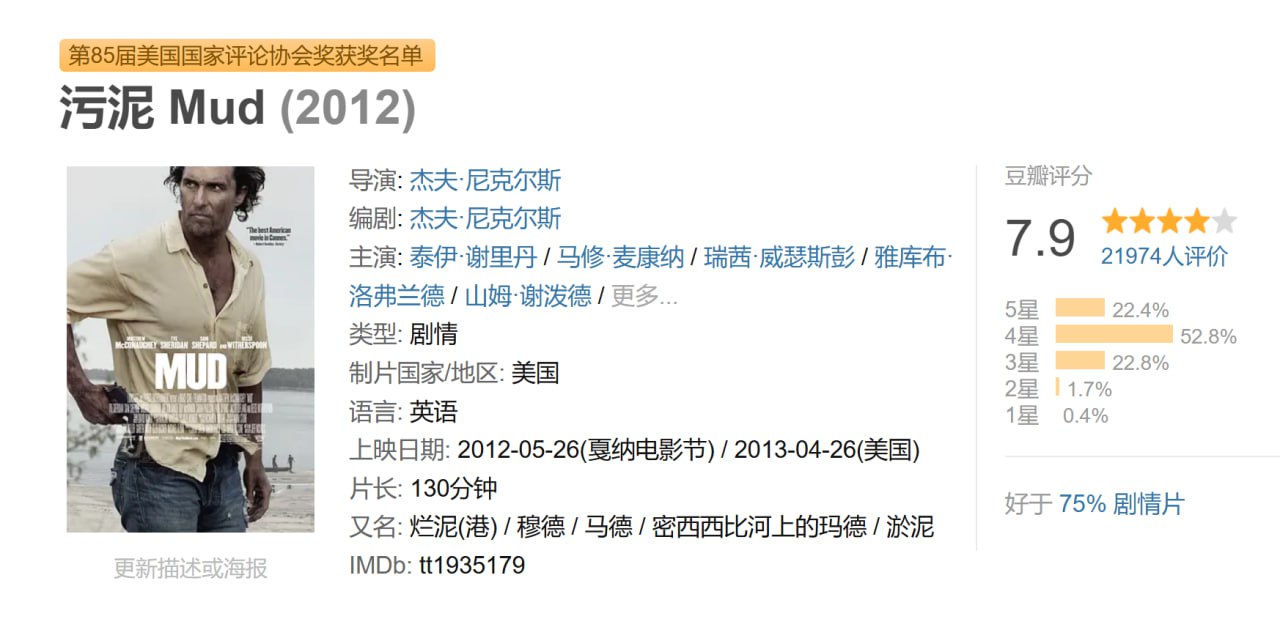 家住密西西比河边的14岁少年埃利斯(泰伊·谢里丹 Tye Sheridan 饰)和好友奈克在河中心小岛上发现了一艘废弃的船,同时还有暂住在船上的神秘流浪男子玛德(马修·麦康纳 Matthew McConaughey 饰)。玛德自称幼年时生活于此,因行动不便拜托埃斯利和奈克给予他帮助。家庭处于分崩离析边缘的埃利斯近于本能的信任玛德,向后者提供食物,并了解到玛德与青梅竹马恋人珍妮弗(瑞茜·威瑟斯彭 Reese Witherspoon 饰)痴缠多年并为之杀人的往事,原来玛德此刻在孤岛上正是躲避赏金猎人追杀的同时欲带走珍妮弗。埃利斯愿意相信玛德的爱情,尽管生活充满了令人失望的底色,他愿意助这位陌生的大朋友一臂之力……