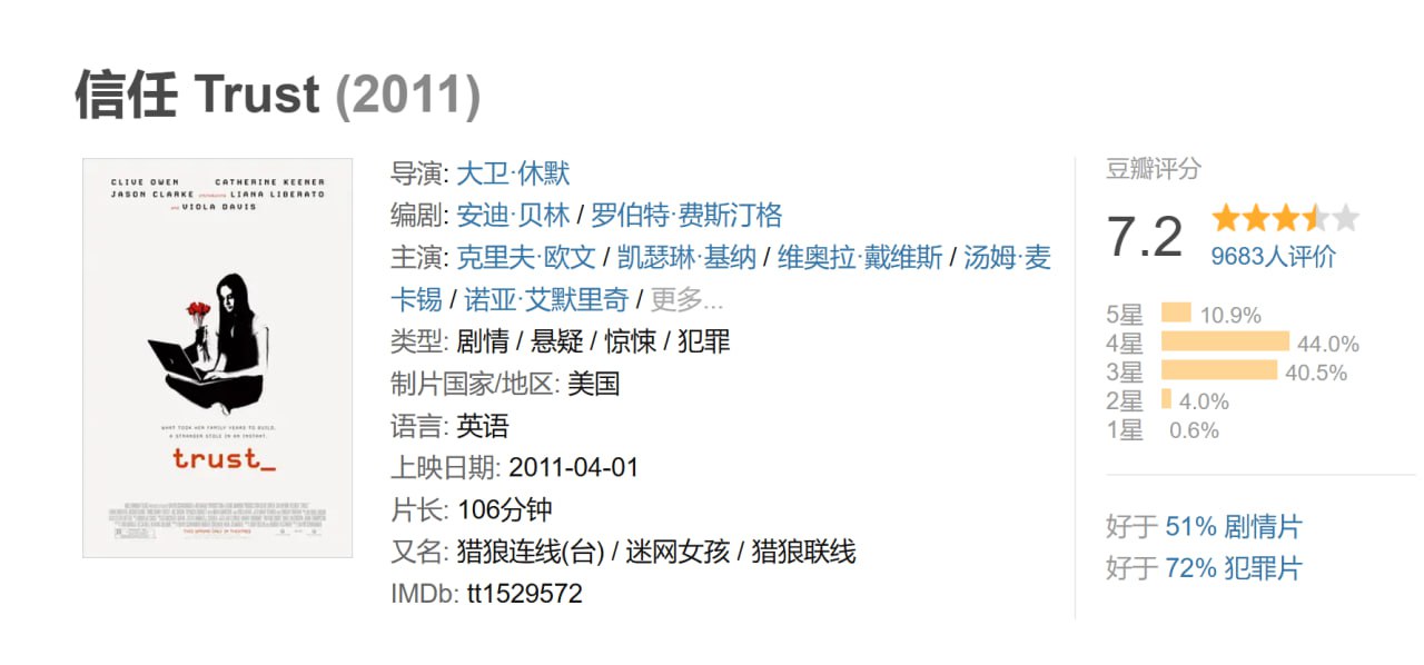 英俊沉稳的威尔(克里夫·欧文 Clive Owen 饰)和妻子林恩(凯瑟琳·基纳 Catherine Keener 饰)还有青春期的女儿安妮(丽亚娜·莱伯拉托 Liana Liberato 饰)一起住在一个太平的社区,事业一帆风顺,生活安稳而美满,是一个令人羡慕的幸福家庭。可这一份平静随着女儿新结交的网友开始发生改变。14岁的安妮在网上认识了一个名叫查理的16岁男孩。而威尔和林恩起初并未太介怀,也对安妮的交友表示赞同。直到有一天安妮和查理安排了见面,让她吃惊的是:原来那个每天在网上与她交流的16岁英俊男孩并不真正存在。真正与她每天交谈的人竟然是一个可悲的的40岁中年男子。而更可怕的事情发生率,这个有恋童癖的陌生人强奸了安妮,从此威尔一家发生了天翻地覆的改变。而从来做事冷静的威尔终于忍不住爆发,他要为14岁的女儿讨回公道……