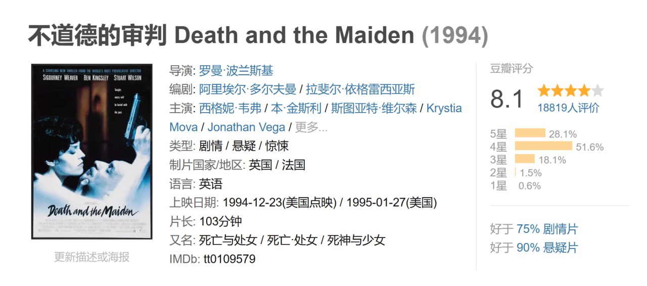 波利娜(西格妮·韦弗 Sigourney Weaver饰)曾经被一个男子施暴,被蒙着眼的她一直不知道罪人是谁,她的性格也变得神经兮兮。她的丈夫杰拉多(斯图尔特·威尔逊 Stuart Wilson饰)当选委员会主席后回到家中,就发现波利娜有着一些比平时更怪异的举动。她甚至把前来拜访的邻居米兰达(本·金斯利 Ben Kingsley饰)的车子推落山崖,凭着米兰达车里的磁带“死亡和处女”,以及米兰达的气味和呼吸,波利娜坚信,米兰达就是当时对她施暴的元凶。