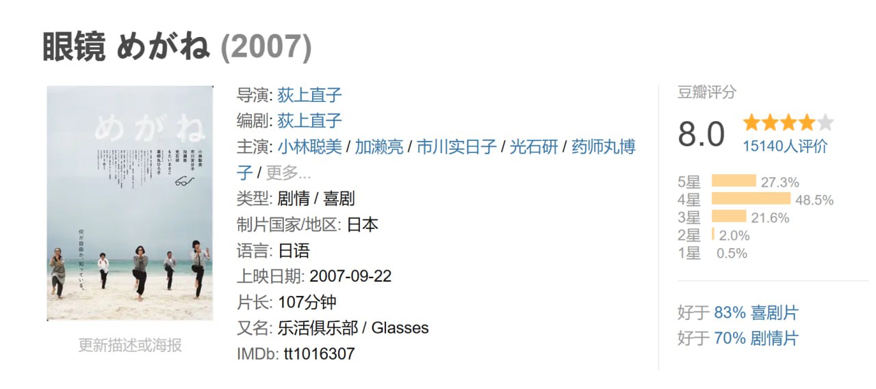 初春,度假的妙子(小林聪美 饰)坐飞机来到南方一个海岛小镇上,在住宿的旅馆里,她遇上了一群人:养了一条和自己同名爱犬的旅馆主人裕二(光石研 饰),戴着一副眼镜经常微笑的刨冰高手樱(罇真佐子 饰),不是旅馆客人但经常在附近转悠的高校教师春奈(市川实日子 饰)以及前来找妙子的青年艾草(加濑亮 饰)。五个人戴着眼镜每天一起在海边做奇怪的早操,然后一起吃早饭……,虽然生活平静而美好,但妙子还是决定继续旅行……