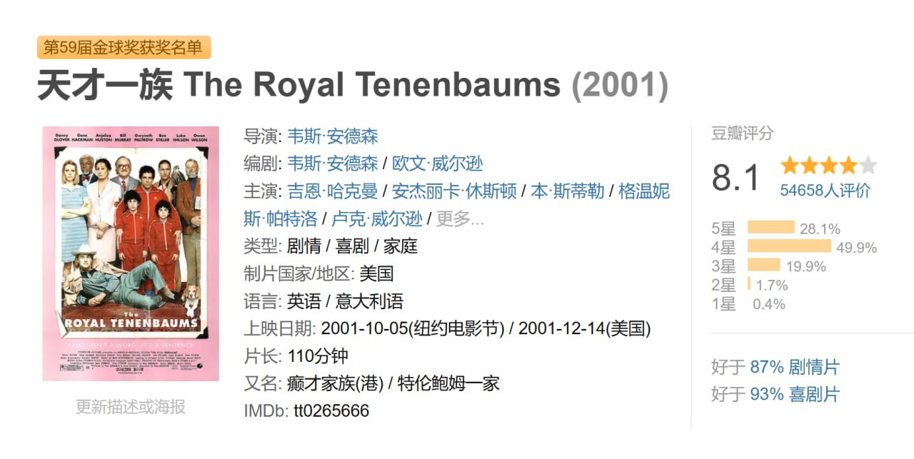 Royal Tenenbaum(吉恩·哈克曼 Gene Hackman 饰)45岁那年夫妻分居,他一个人去住酒店,独自抚养孩子的妻子Etheline(安杰丽卡·休斯顿 Anjelica Huston 饰)把所有重心都放在了孩子才能的培养方面。不负众望,他们的三个孩子个个 都是天才,她以此写作了一本书——《天才一族》。