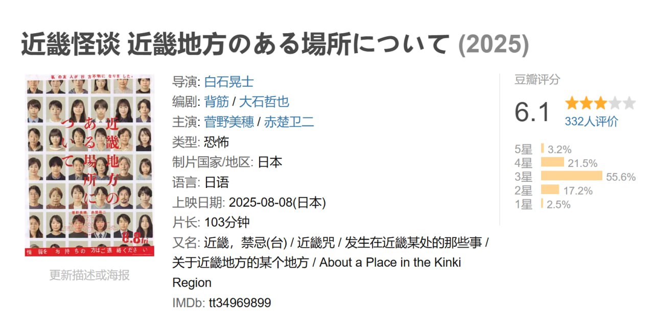 影片改编自背筋的同名恐怖小说,讲述一位灵异杂志编辑神秘失踪。在失踪前,他正在调查未解决的案件资料、与超自然现象有关的专题文章、甚至是被封存的采访笔记等各种未解之谜——种种线索都指向了“近畿地方的某个地方”。编辑部同僚小泽与自由撰稿人千紘携手追踪其失踪之谜,发现所有怪异事件似乎都围绕着同一个地方展开。