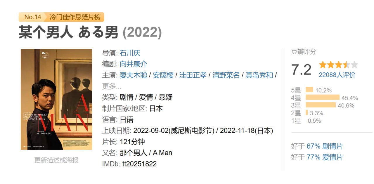 律师城户章良(妻夫木聪 饰)收到来自谷口里枝(安藤樱 饰)女士的委托,她的丈夫“谷口大祐”(洼田正孝 饰)在伐木现场遭遇意外丧命,而常年疏于联系的大祐的哥哥恭一在看到遗像后却说,这不是大祐,而是另一个人。里枝只能委托多年前帮她办理离婚的律师城户帮助调查,这个现实生活中的“谷口大祐”究竟是谁呢?