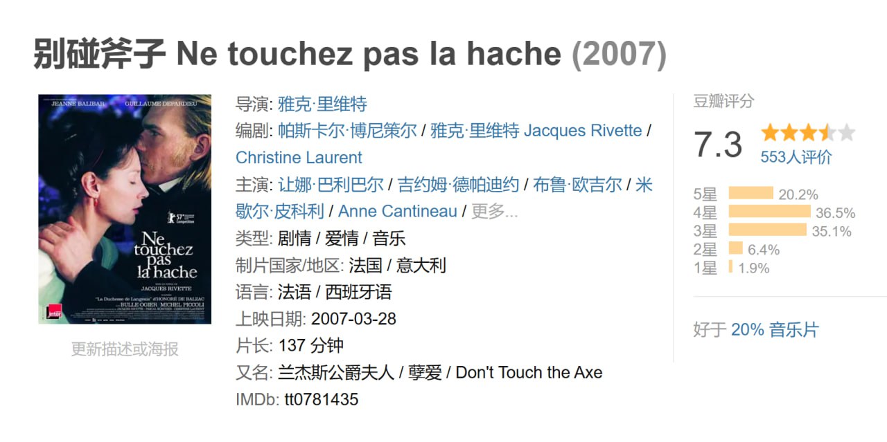 法国新浪潮导演里维特作品,根据巴尔扎克小说改编,讲述两个贵族男女相爱但却互相折磨的故事。